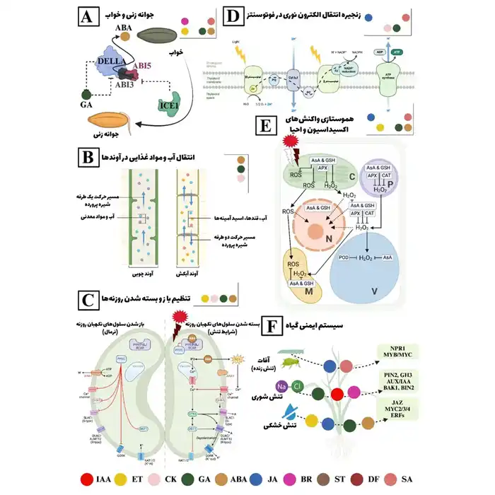 ب. فیتوهورمونها بر صعود شیره گیاهی تأثیر میگذارند. مطالعات مختلف نشان دادهاند که سیتوکینین (CK)، جیبرلینها و اسید آبسزیک میتوانند انتقال آب و مواد مغذی را در شرایط فیزیولوژیکی و تنشزا تنظیم کنند. (B)
